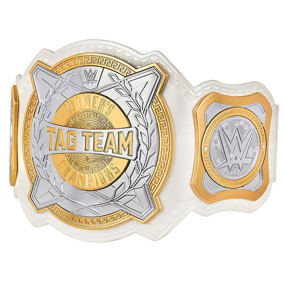 - Design: White strap, gold-plated zinc alloy plates, silver detailing, WWE logo, Greek meander patterns, “Women’s” & “Tag Team” Champion Belt.