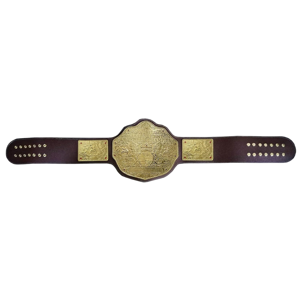 The “Big Gold” championship belt is a classic professional wrestling belt known for its iconic design featuring a large center plate with a globe, often surrounded by other emblems like crowns, lions, and banners that say “World” and “Champion”. It is typically made of brass with gold plating and is attached to a black leather strap, with detailed engravings and often includes intricate side plates. The belt’s history includes being used by multiple major promotions like the NWA, WCW, and WWE.